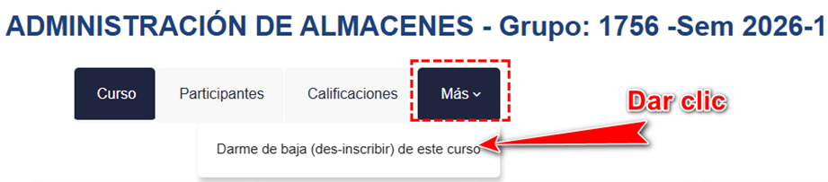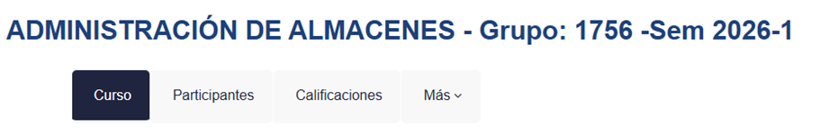 3. Una vez dentro de la asignatura, verás el nombre de la asignatura, abajo encontrarás el menú con acceso al Curso, Participantes, Calificaciones y una opción que dice Más ∨.